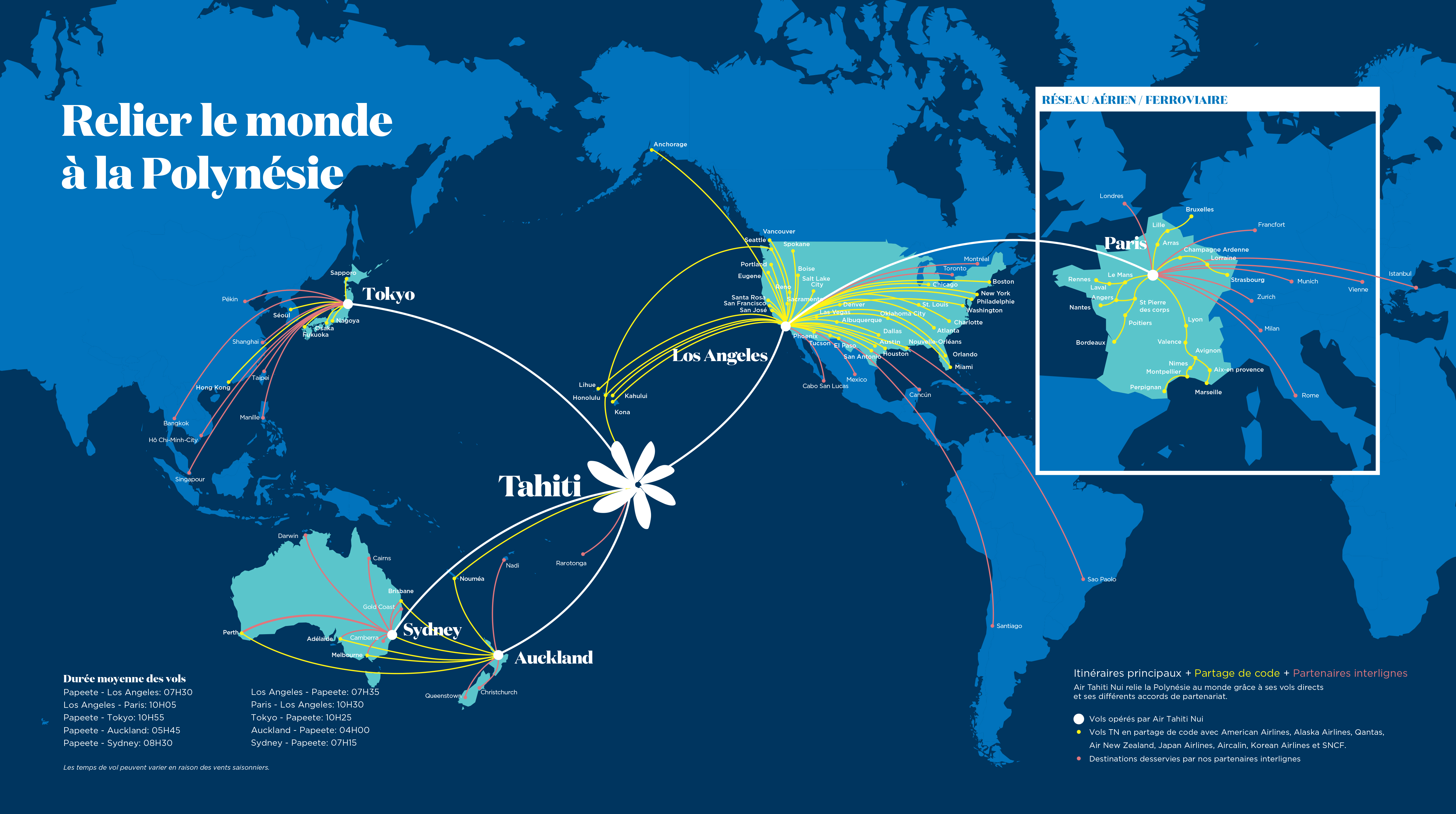 Air Tahiti Nui verbindet Tahiti mit dem Rest der Welt. Wir bieten Direktflüge zwischen Tahiti und Paris, Los Angeles, Auckland, Sydney und Tokio an Bord unserer Boeing 787-9 Tahitian Dreamliners an.